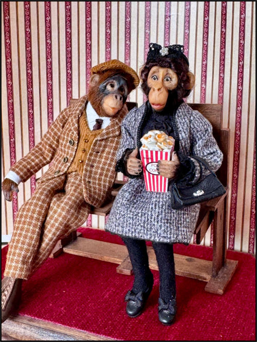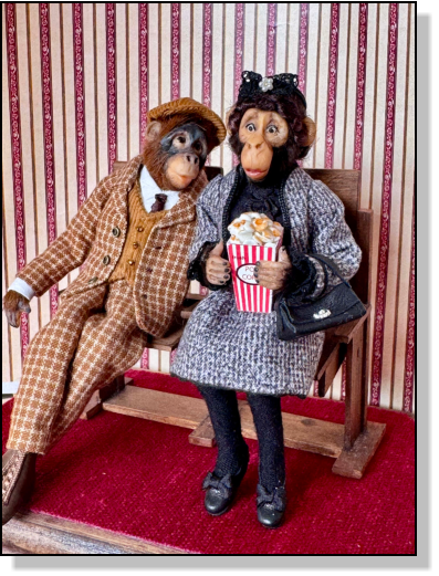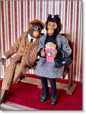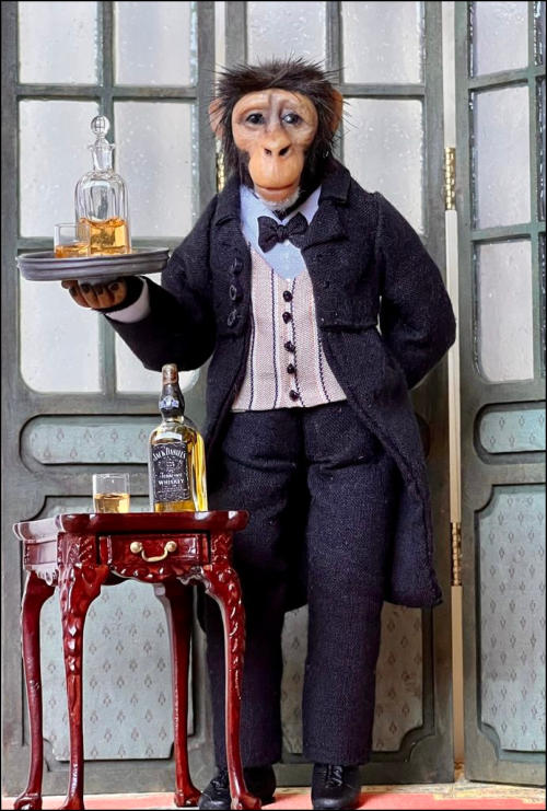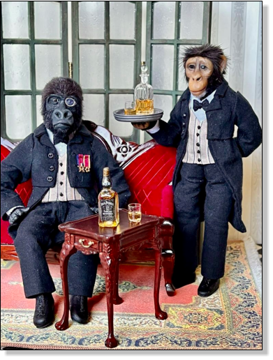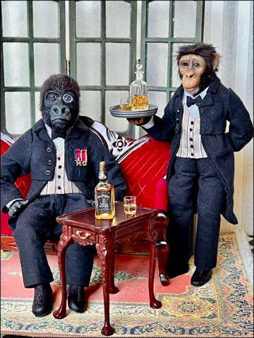 Die Affen , 1x Gorilla -Ich nenne ihn Der General , und Schimpansen Butler . AusgestattetMit Whisky +Gläser vom Glasbläser Gerd Felka.