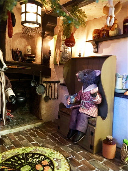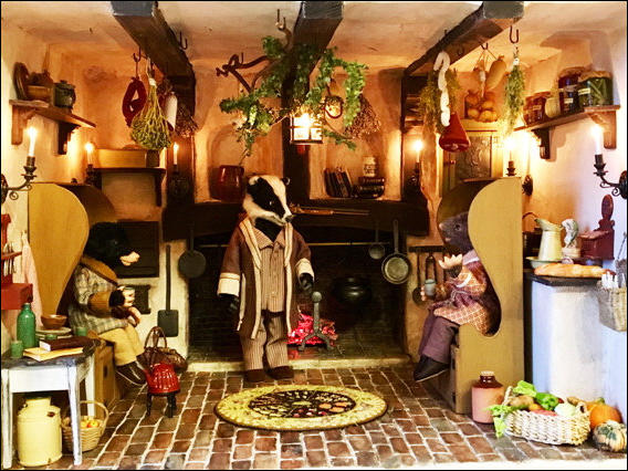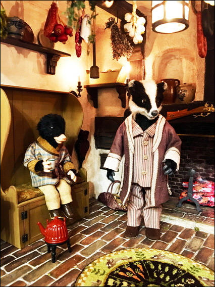 Badger, Mole und Ratty unterhalten sich bei einer Tasse Tee, während im Kamin ein wärmendes